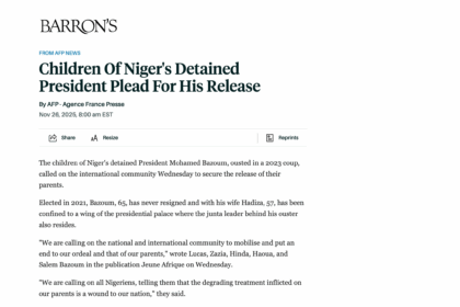 Les enfants du président nigérien déchu, Mohamed Bazoum, prisonnier d’une junte militaire depuis son renversement par un coup d’Etat en 2023, ont demandé mercredi 26 novembre à la communauté internati...