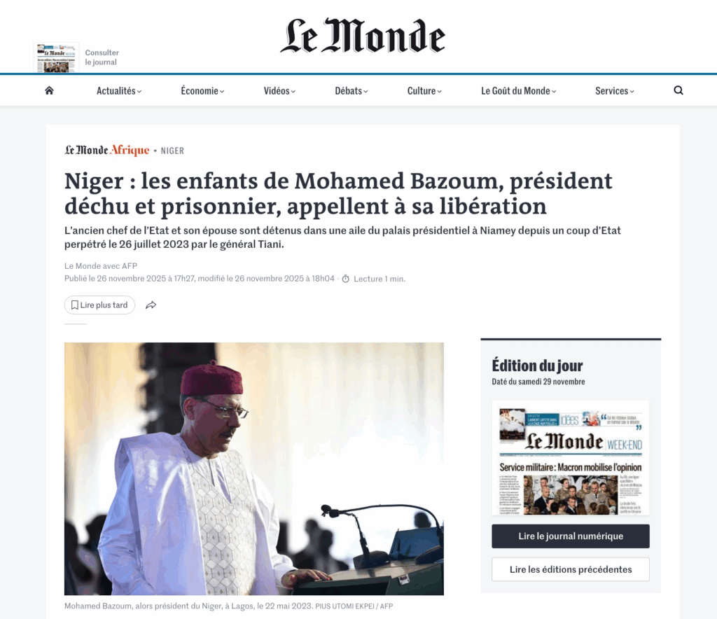 Les enfants du président nigérien déchu, Mohamed Bazoum, prisonnier d’une junte militaire depuis son renversement par un coup d’Etat en 2023, ont demandé mercredi 26 novembre à la communauté internationale de se mobiliser pour la libération de leurs parents, dans une tribune publiée par le média Jeune Afrique. Détenu avec son épouse, M. Bazoum, élu en 2021, n’a jamais démissionné.